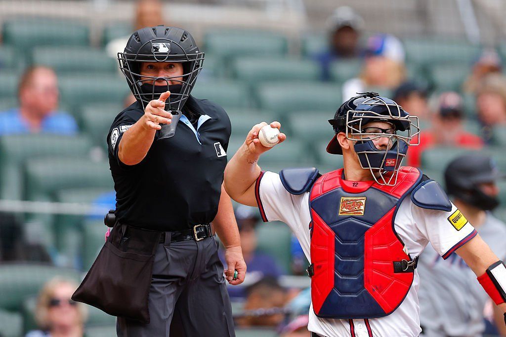 Umpire Jen Pawol during a game between the Miami Marlins and Atlanta Braves. Photo by Todd Kirkland/Getty Images