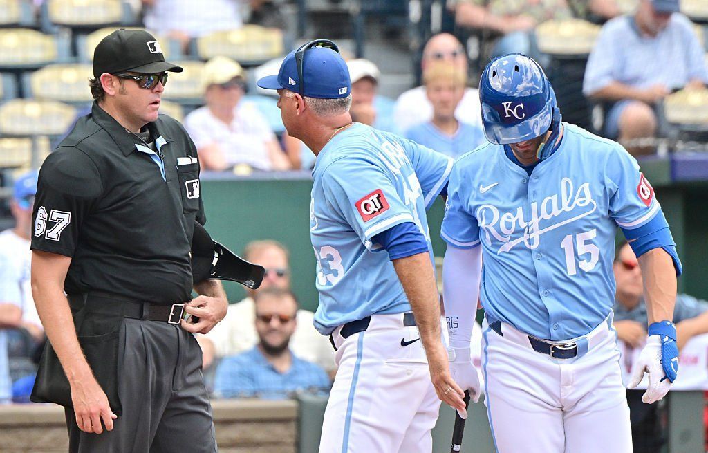 Kansas City Manager Matt Quatraro argues with home plate umpire Ryan Addition on August 13, 2025, at Kauffman Stadium in Kansas City, MO. Photo by Keith Gillett/Icon Sportswire via Getty Images