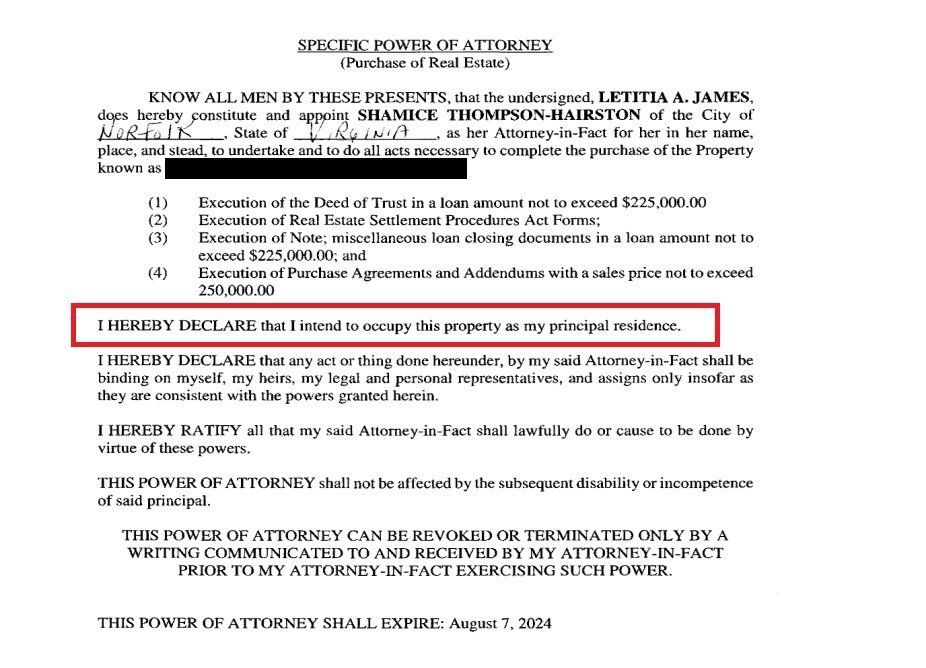 The Virginia land records about the purchase include a "specific power of attorney" document authorizing Thompson-Hairston to act as James' attorney-in-fact. In this document, James states: "I HEREBY DECLARE that I intend to occupy this property as my principal residence."