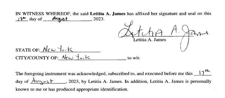 The "specific power of attorney" document was signed and notarized on August 17, 2023. Except for the inclusion of her middle initial, the signature that appears on it seems to match the signature James regularly stamps on New York documents.