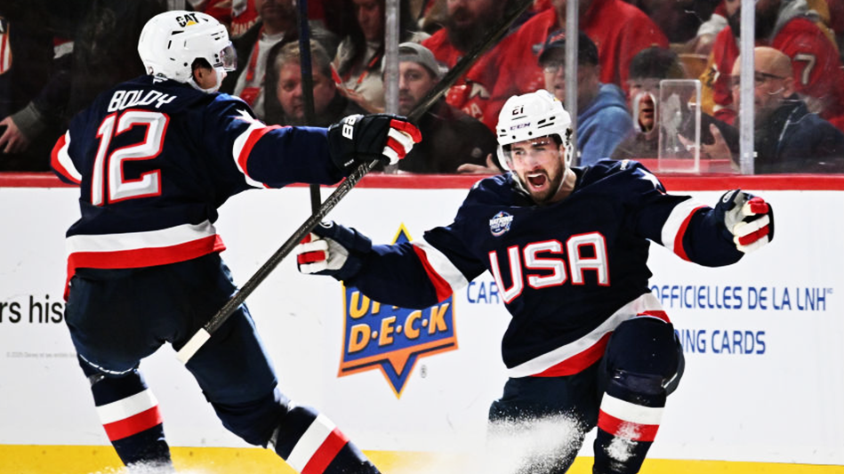 Matthew Tkachuk of Team USA fights Brandon Hagel of Team Canada at the Bell Centre on February 15, 2025, in Montreal, Quebec, Canada. Photo by Minas Panagiotakis/Getty Images
