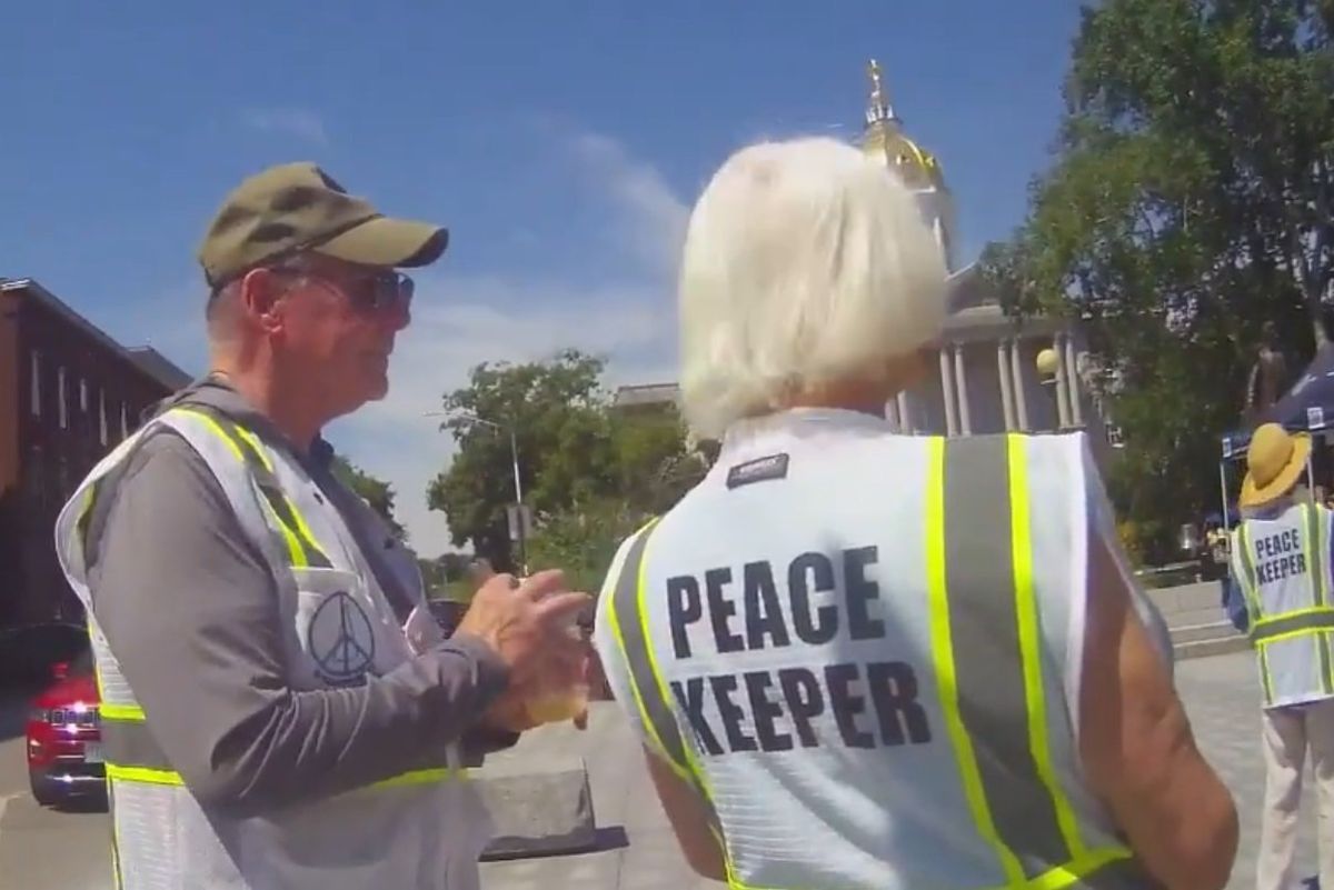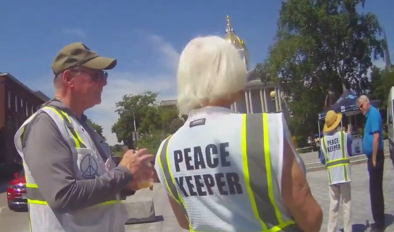 Though the timestamps on the following videos show an array of dates and times, all were filmed at a Pride event called Rainbow Recess, sponsored by the New Hampshire ACLU and held on the statehouse lawn on June 2, 2024. The peacekeepers are easily identifiable by the yellow lining and peace signs on their vests.