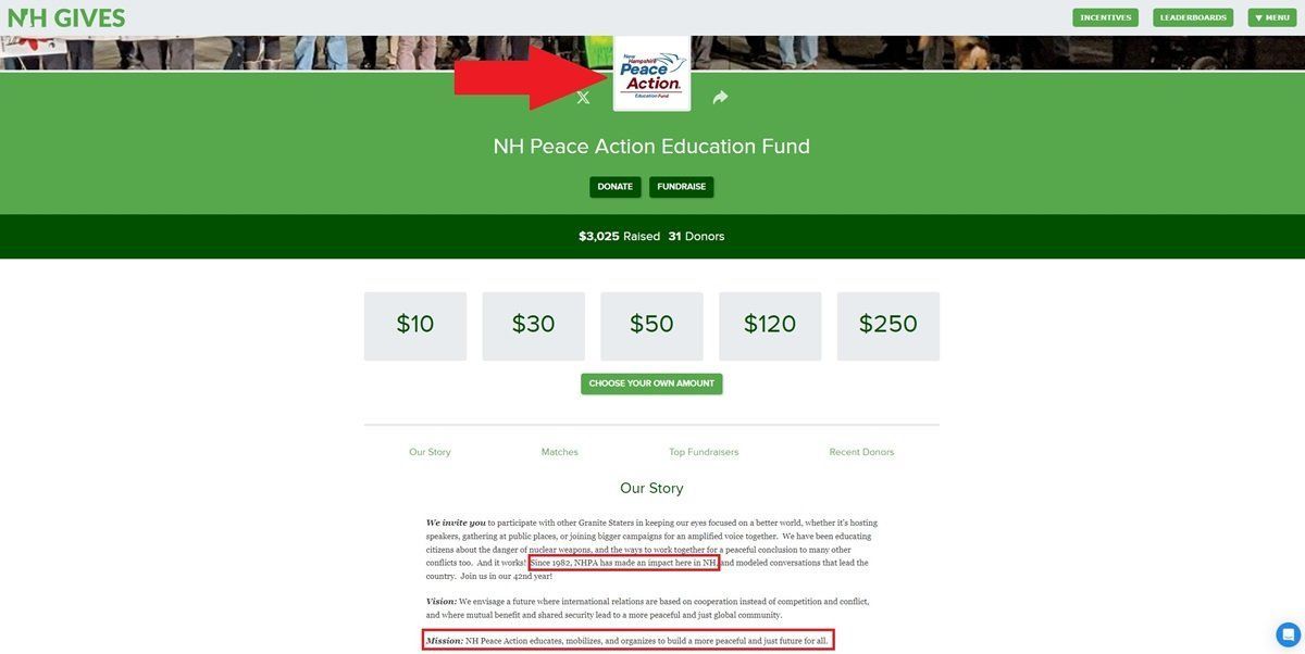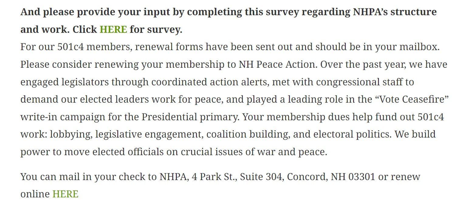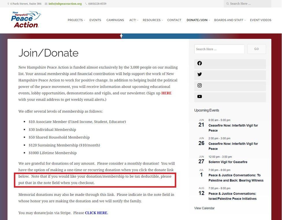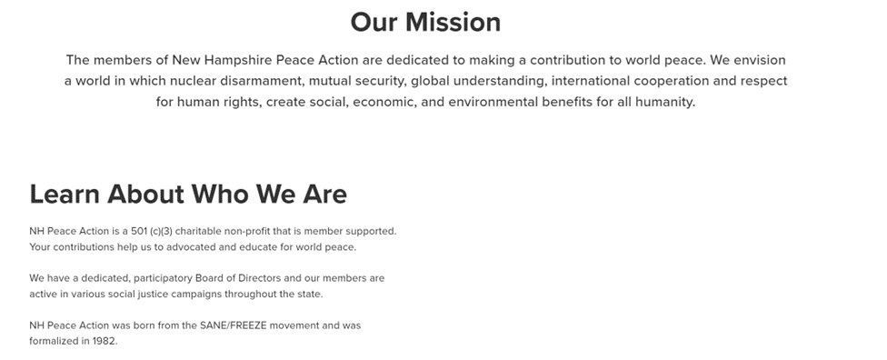Screenshot of nhpeaceaction.org taken on June 21, 2024