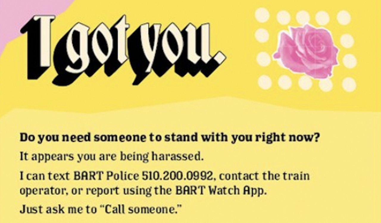 The post includes a video featuring two female college students who ride BART and explain how the cards work. When riders are being harassed, they can hand out the "You got me?" cards as a request for help; when riders believe they are witnessing others being harassed, they can hand out the "I got you" cards to the perceived victim: