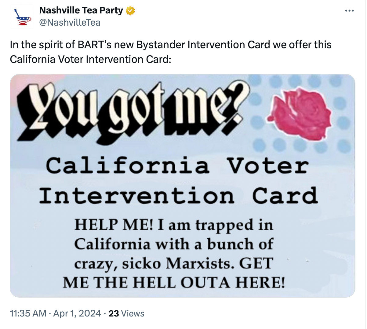 As you might expect, critics haven't been too kind to BART and its "bystander intervention cards." As of Monday afternoon, BART's primary post is getting ratioed at two-to-one rate. Here are but a few of the many blistering reactions: