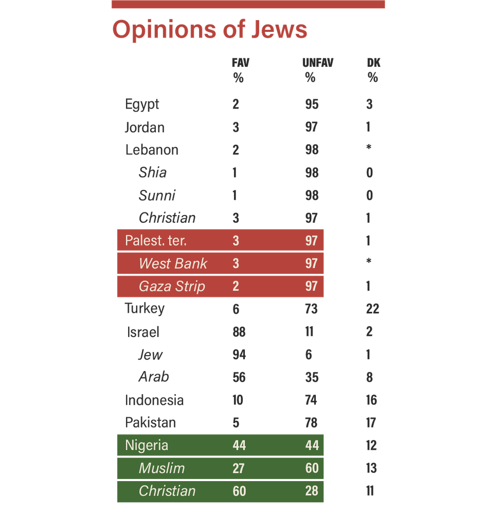 As you can see, both Middle Easterners and Muslims have near-unanimous unfavorable views of Jews. But as you move away from the Middle East to divided countries like Nigeria, the dichotomy between Muslims and Christians in their sentiment toward Jews becomes quite pronounced.