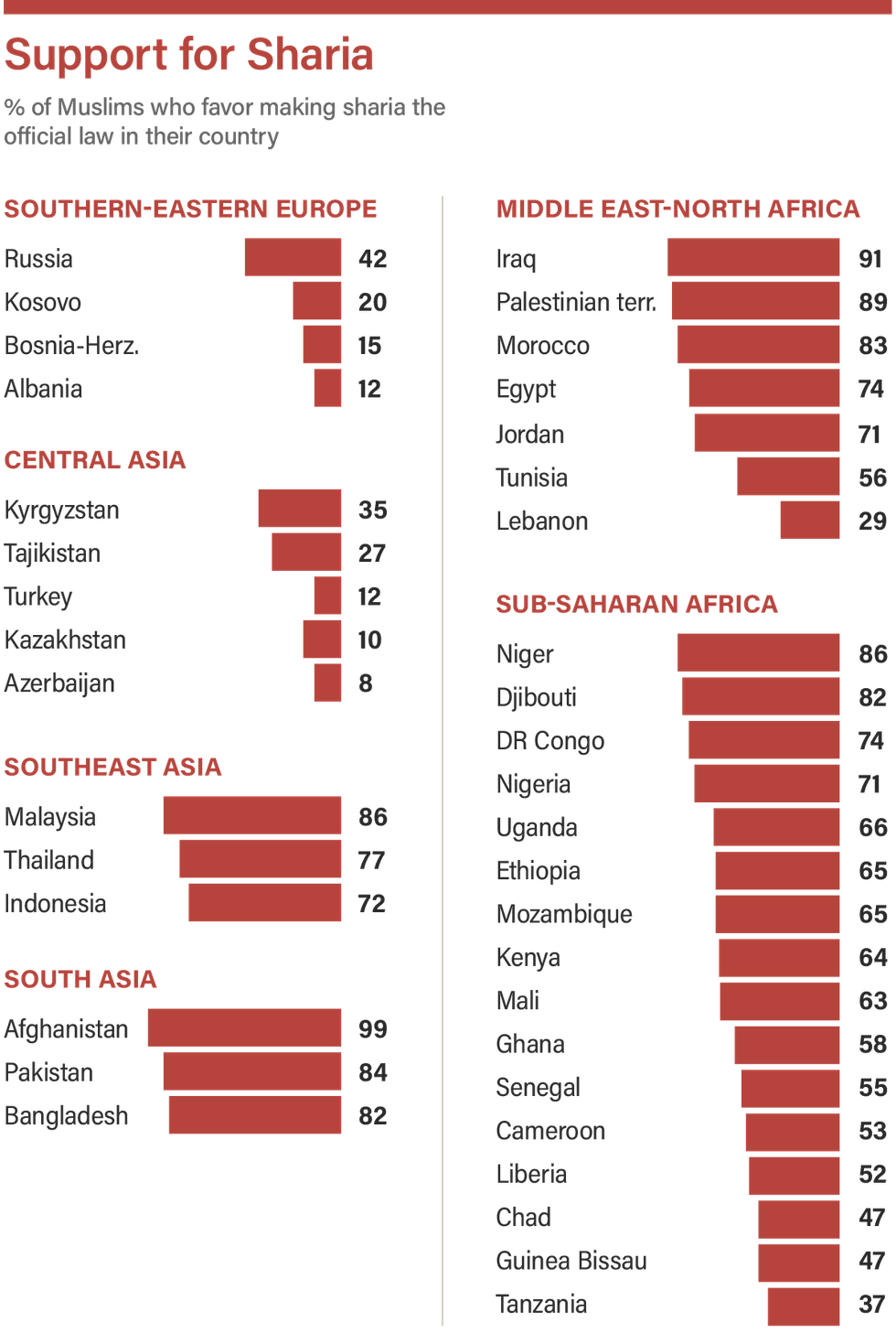 A Pew poll from 2017, however, revealed near-unanimous support for Sharia law among Palestinians, as well as countries like Iraq and Afghanistan, from which we’ve admitted hundreds of thousands of immigrants over the past 20 years.