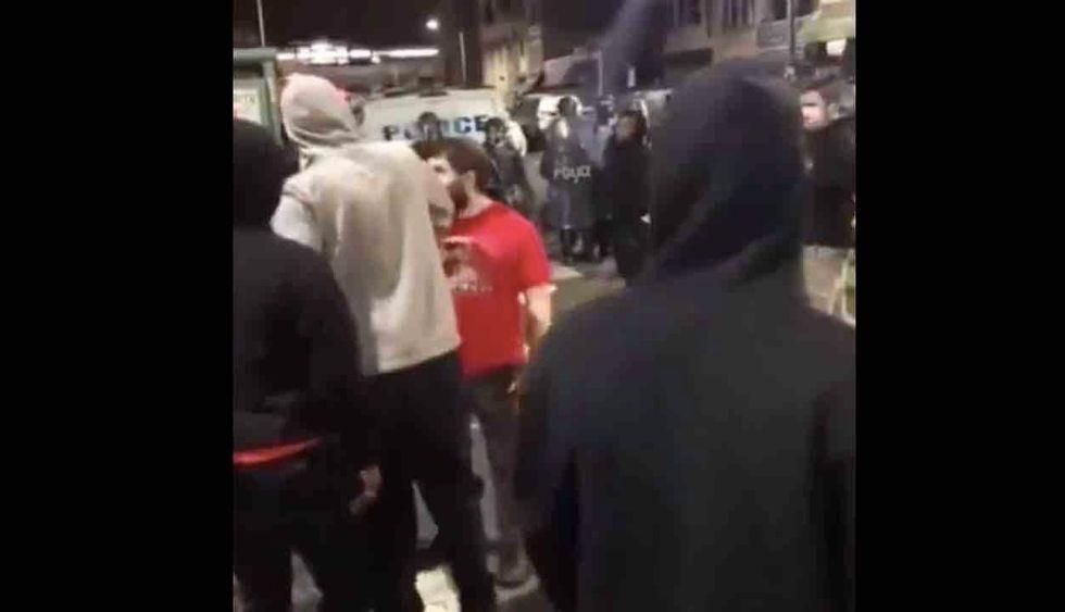 Fortunately, things don't escalate from there — but boy oh boy, it sure must have been comforting that numerous police officers in riot gear were lined up just feet away.