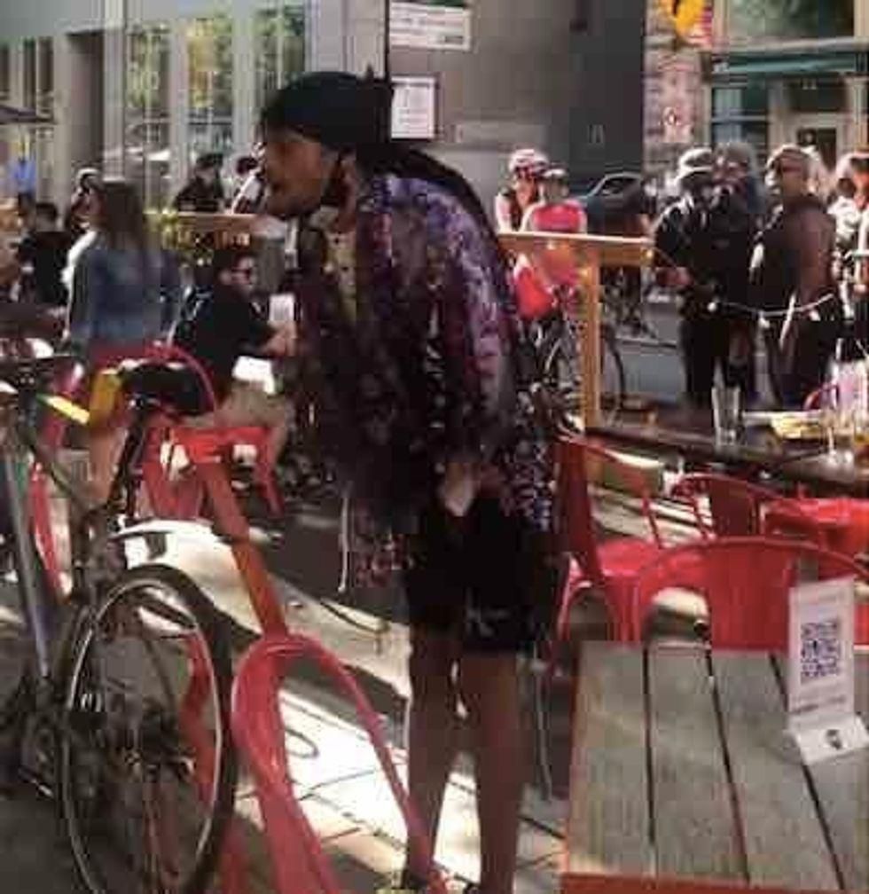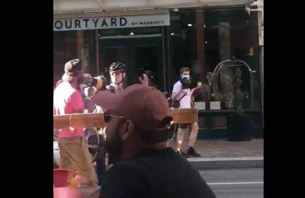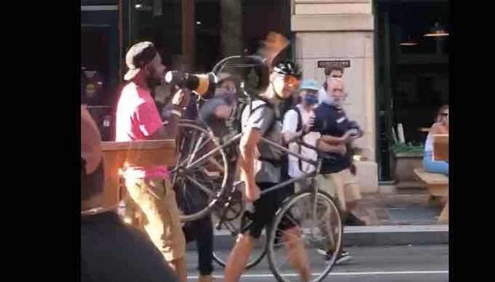 In a separate video at the scene, it appears McDowell shoves his megaphone into the head of a man holding a bicycle in the street: