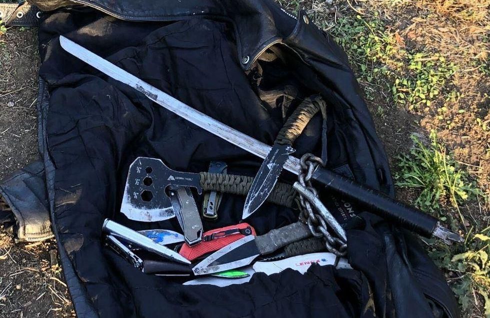 Following the incident, Haylett was transported to a local hospital for evaluation. In all, police found he had been in possession of 15 weapons, including a sword, an axe, several knives — and yes, even a slingshot.