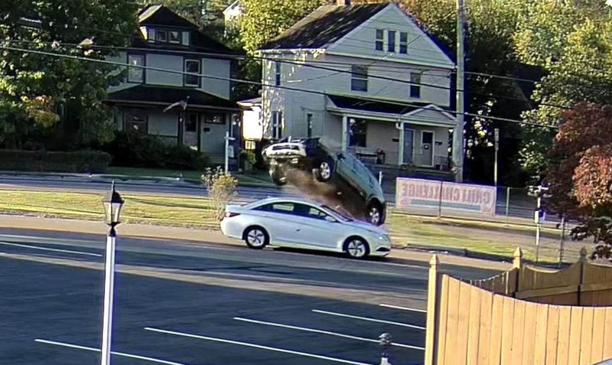 At the last moment, the SUV struck a road sign and an old post and appeared on video to leap into the air above Fr. John's Hyundai Sonata.
