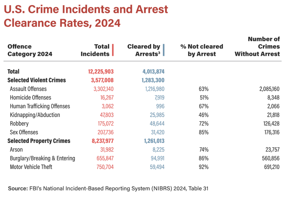 Look at the numbers. In 2024, the FBI’s incident-based reporting system logged over 12.2 million crimes. Strip away drug and gun cases, and the picture remains grim: 2.4 million violent crimes with no arrest. Another 1.25 million serious property crimes — arson, burglary, motor vehicle theft — with no arrest. Every year, more than a million offenders escape justice. Meanwhile, the nation’s prison and jail population sits at roughly 1.9 million.