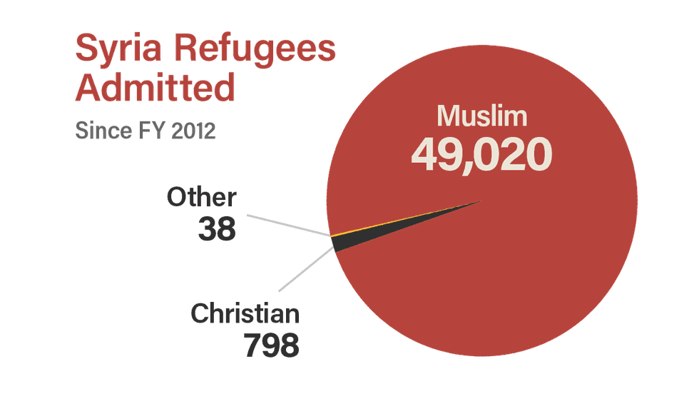 Of the 50,000 Syrians admitted as refugees, only 798 have been Christians, and just 28 Yazidis have been granted refugee status. Even from Iraq, where Yazidis were slaughtered by ISIS, the U.S. has admitted only 161 Yazidi refugees.