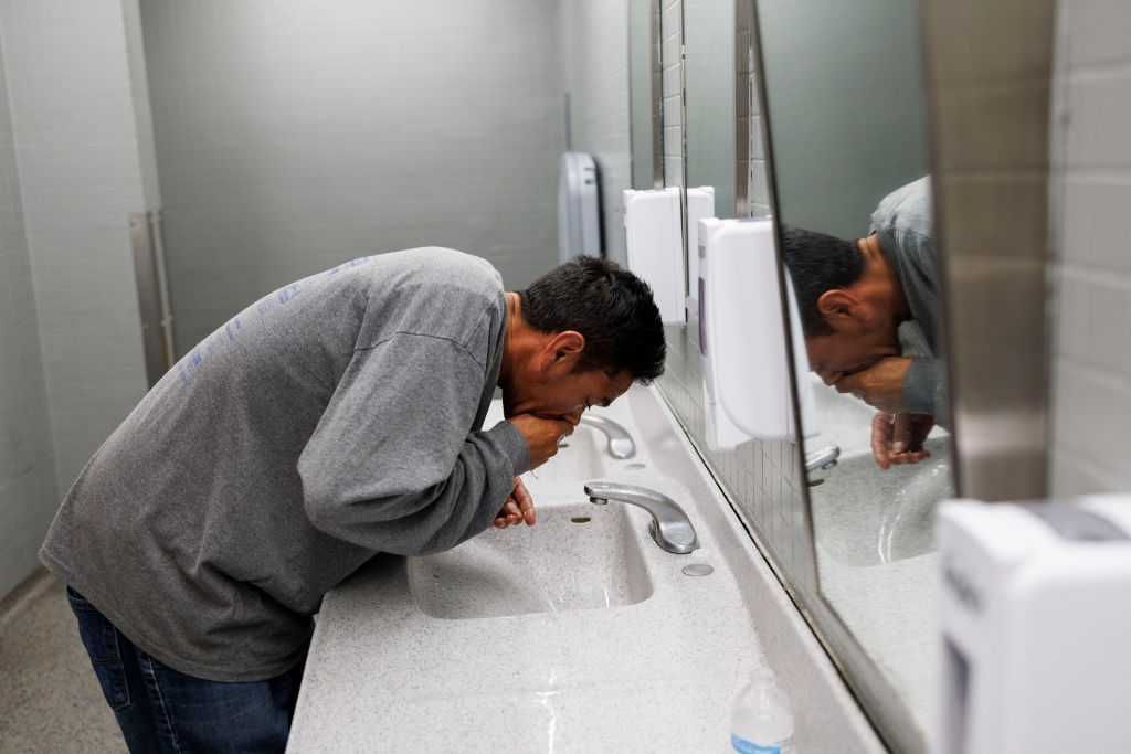 Jimmy Arias, 46, from Venezuela, washes his face in the bathroom of a makeshift shelter operated by the city at O'Hare International Airport on Aug. 31, 2023. Armando L. Sanchez/Chicago Tribune/Tribune News Service via Getty Images