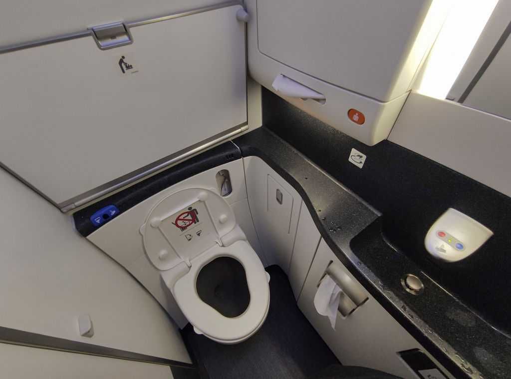 Bathroom aboard a United Airlines Boeing 787 Dreamliner aircraft. Photo by Nicolas Economou/NurPhoto via Getty Images