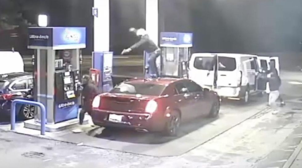 At least one of the crooks had a flair for the dramatic, hopping out of a white van parked in front of the targeted car — a red 2022 Chrysler 300 — jumping on the car's roof, and pointing a gun at the car's owner, who appeared to be about to begin pumping gas.