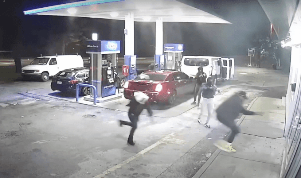 Three other crooks armed with rifles and handguns also emerged from the van, and all four gunmen chased the victim, who ran into the gas station's store.