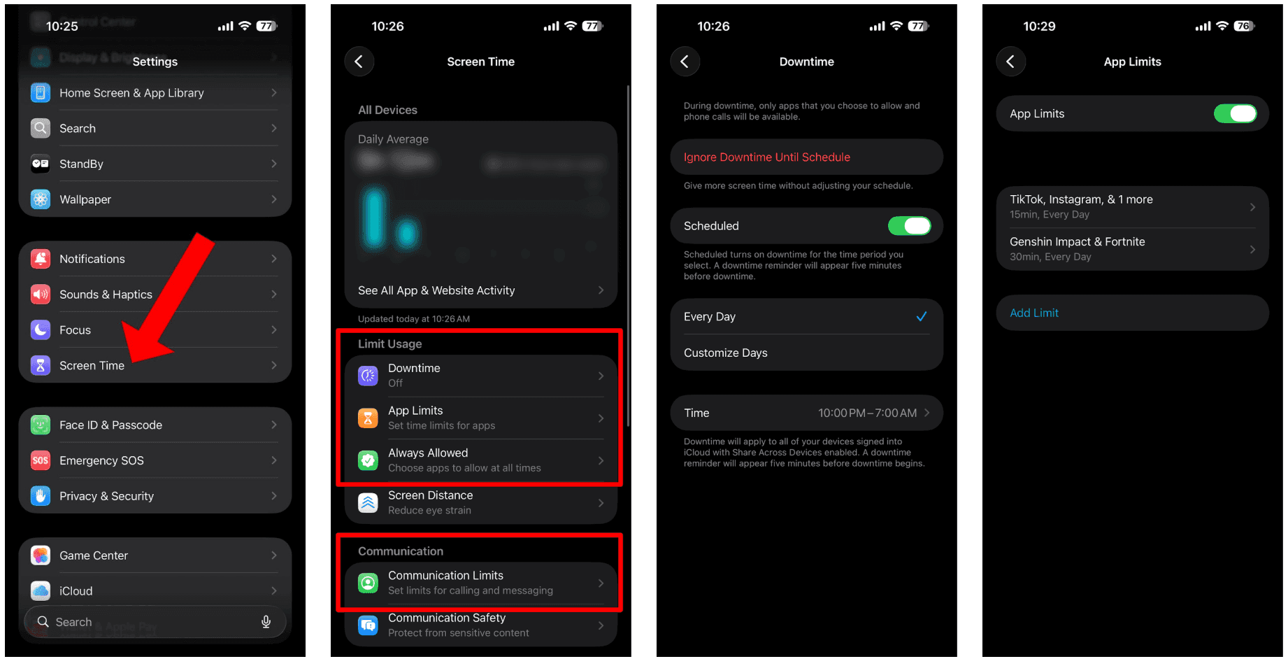 If you want to get even more granular with your settings, “Communication Limits” will allow phone calls, Facetime chats, and messages from specific people during Downtime. For instance, you may only want to receive communications from your closest family and/or friends. Otherwise, you’re completely unreachable.