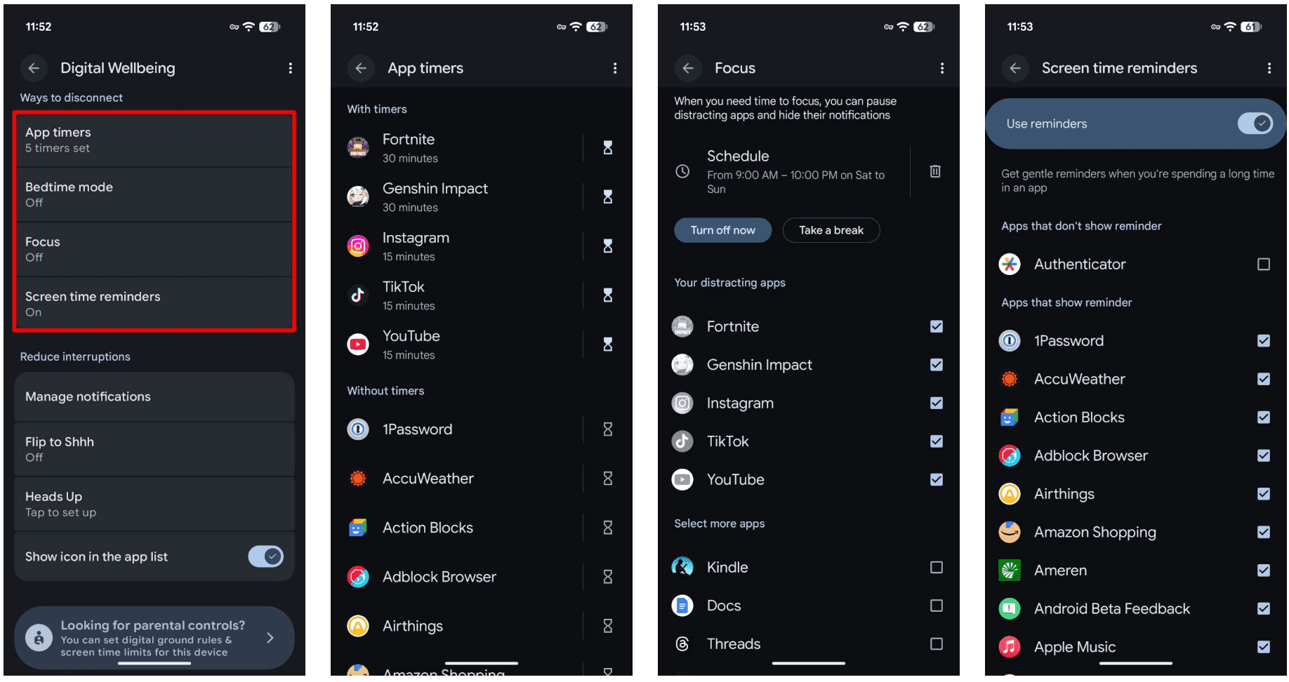 If you’d rather be a little more lax in curbing your app usage, “screen time reminders” will nudge you with a notification if it detects that you’re spending too much time on any particular app on your phone. This can then either encourage you to reduce usage on your own, or if the app is addictive enough, you can add it manually to app timers.