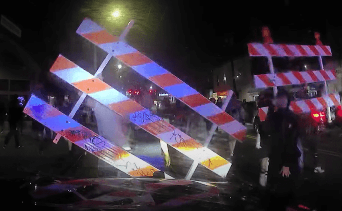 The police cruiser began to back away from the crowd. Some people constructed a makeshift barricade in the middle of the street with bicycles and traffic barriers. Several rioters threw objects that struck the police cruiser.