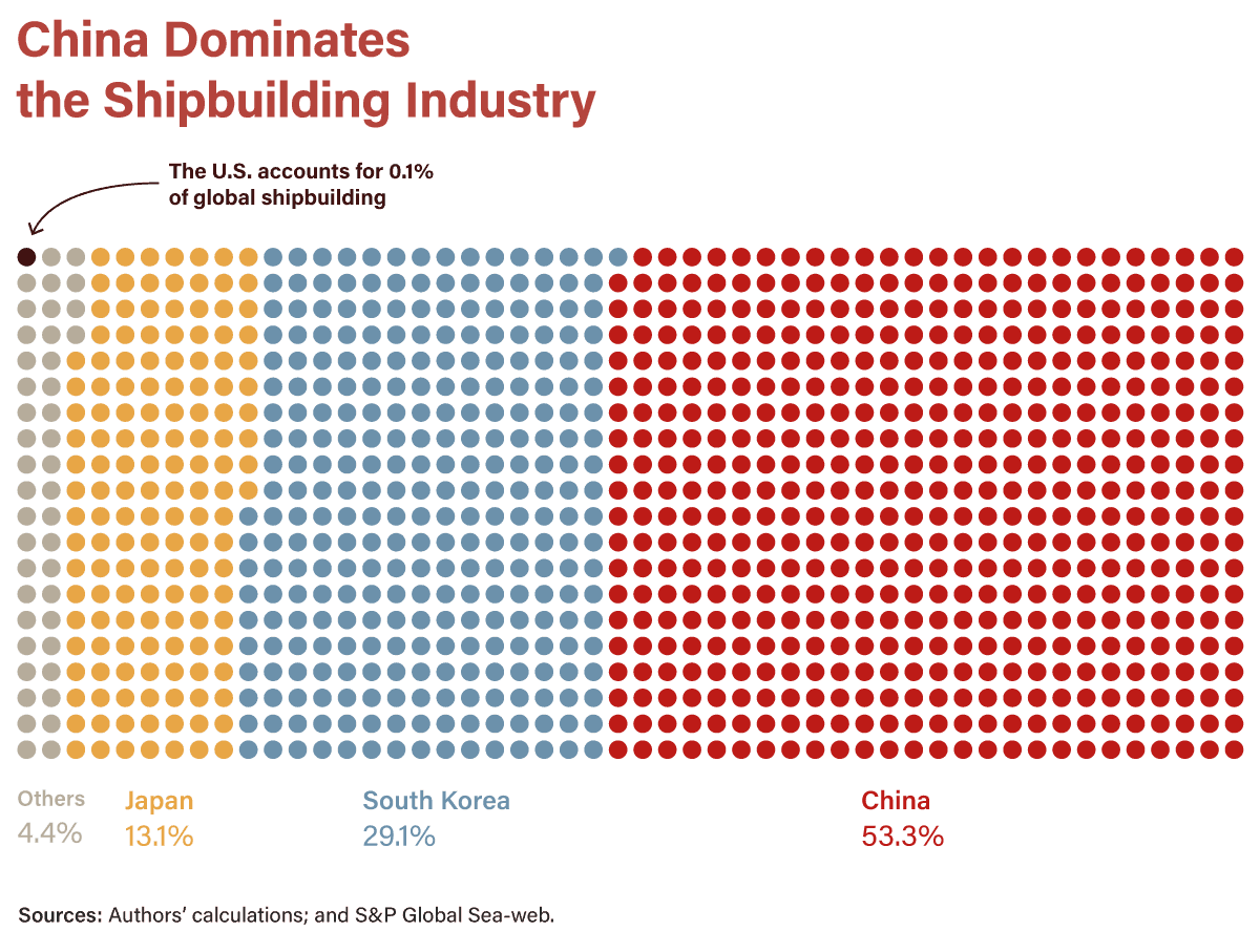 And the problem extends far beyond tech. The U.S. imports its steel, ball bearings, cars, and oceangoing ships. China now builds far more commercial vessels than the United States — by orders of magnitude.