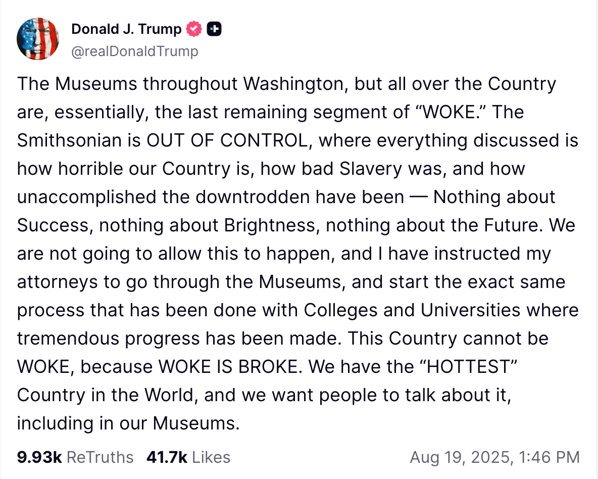 On August 12, the White House, in accordance with President Trump's vision of American exceptionalism, initiated a comprehensive review of eight Smithsonian museums, focusing on exhibition content, curation, and operations. A few days later, President Trump followed up the directive with a Truth Social post, explaining the need for reform in Smithsonian museums.