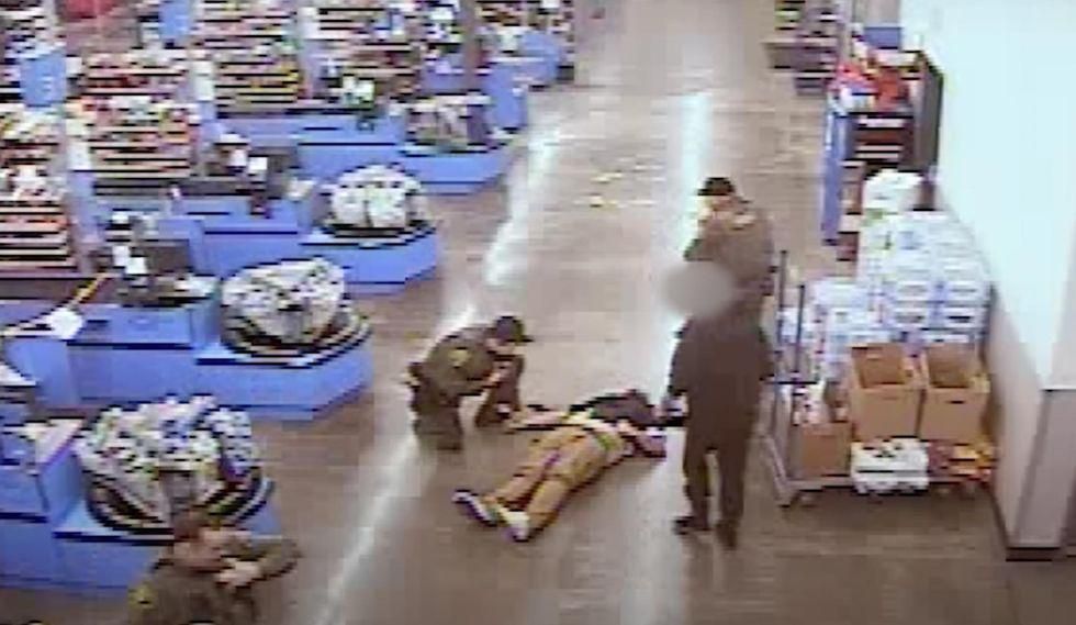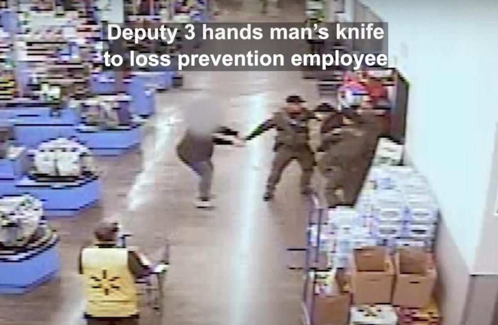 Chainsaw-wielding fugitive walks toward deputy, who orders him to put it down. Instead, fugitive grabs shotgun, points it at deputy — who then opens fire on suspect.