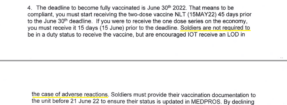 Despite recognizing the governor’s order, the letter implores the doctors to take sides. “As a reminder, it is our job to convince Soldiers to receive the vaccine. If you, personally are not able to fulfill this role, please, privately message the State Surgeon.”