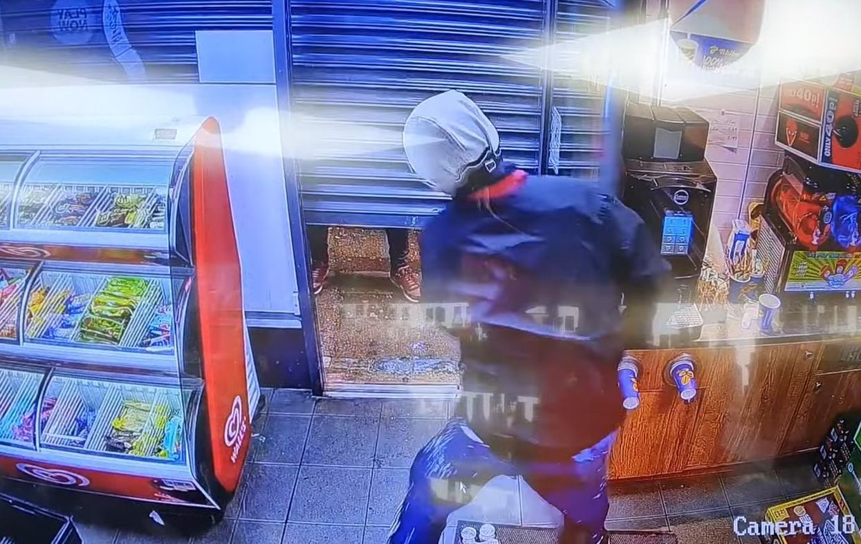 Surveillance footage of the incident shows a man wearing a hooded jacket and mask carrying a four-pack of lager over to the counter, then brandishing the knife. Police indicated Trimble threatened the shopkeeper with the blade.