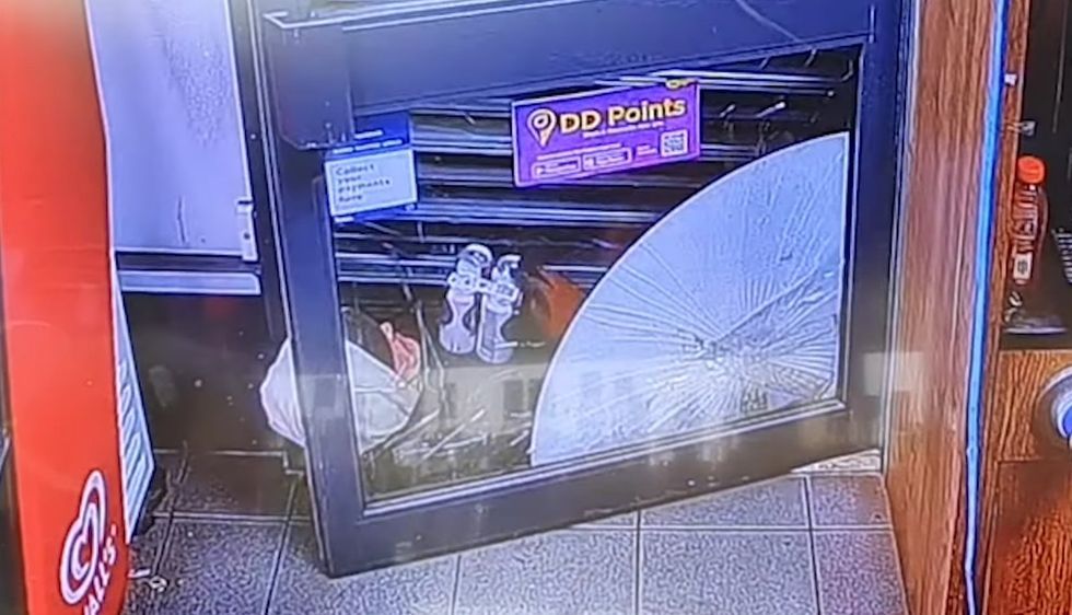 Video: British thief's 'Indiana Jones-style slide' to get past closing shutters fails. Stuck, he drinks to his misfortune.