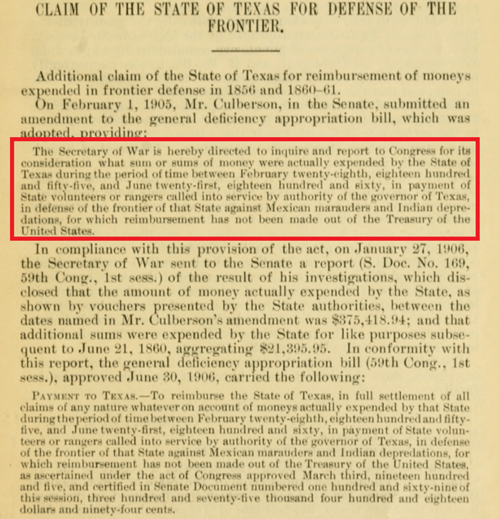 The document shows the tension between the Texas delegation and federal officials in their quest spanning decades to try to secure adequate reimbursement from the federal government for doing what should have been a federal job. Indeed, as late as 1911, Texas Senator Charles Culberson was demanding reimbursement for Texas Ranger border operations 60 years before!