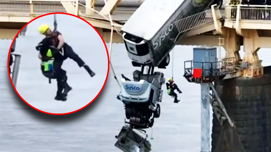 Kentucky firefighters made a death-defying rescue of a truck driver who had veered off the Clark Memorial Bridge due to an accident, causing the cab of the semi-truck to dangle off the bridge over the water.