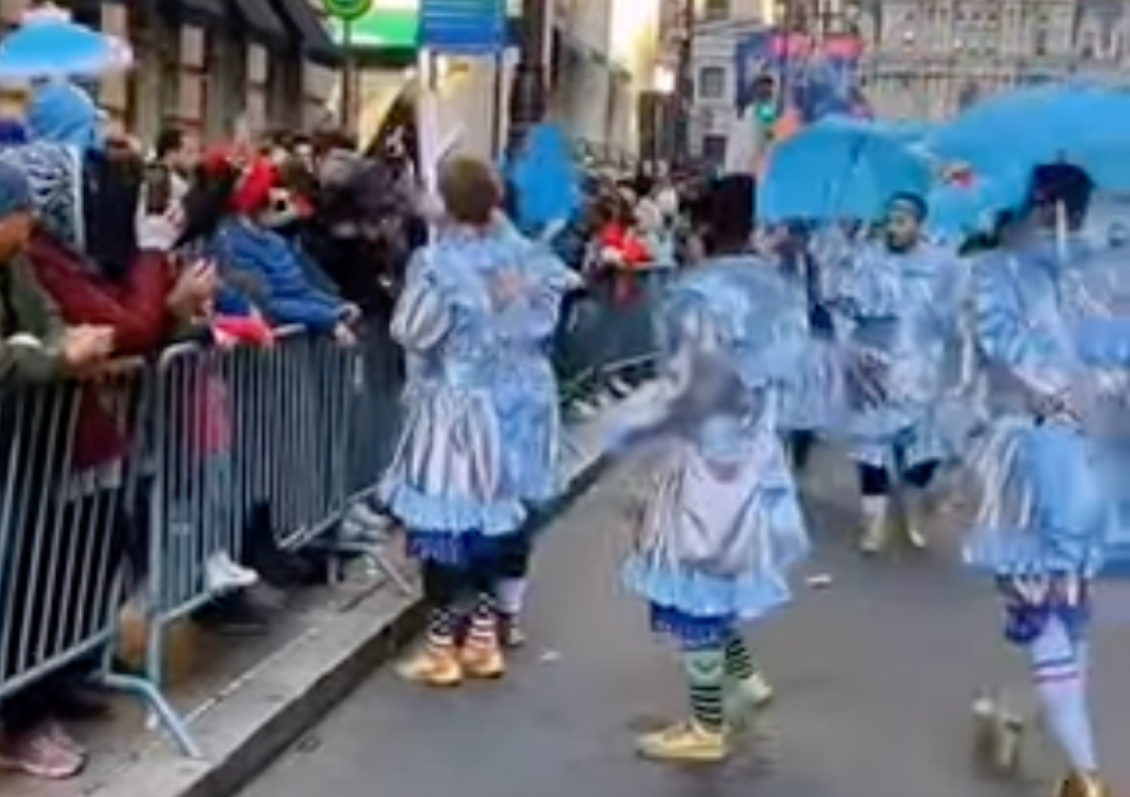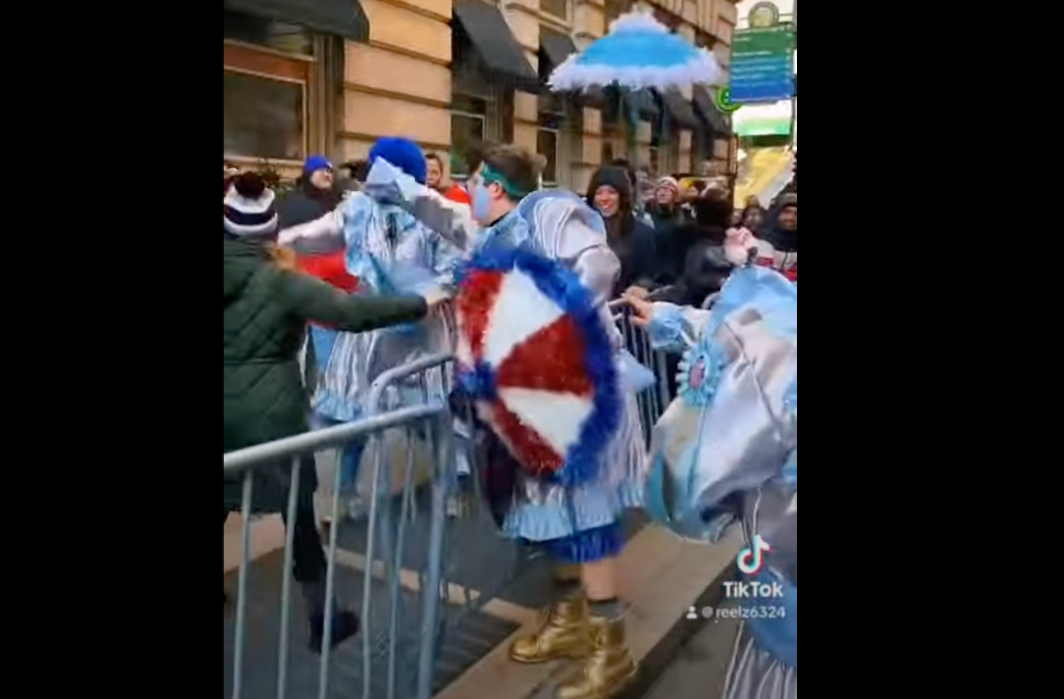 Cellphone video shows the Mummer — decked out in a sky blue-and-silver get-up, accented by American flag socks and gold boots — holding a pole with the Trump flag waving on top and heading to the sidewalk where barriers separate parade watchers from participants.