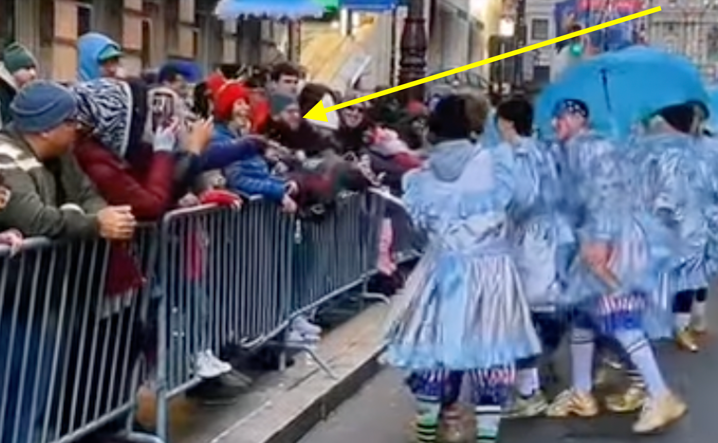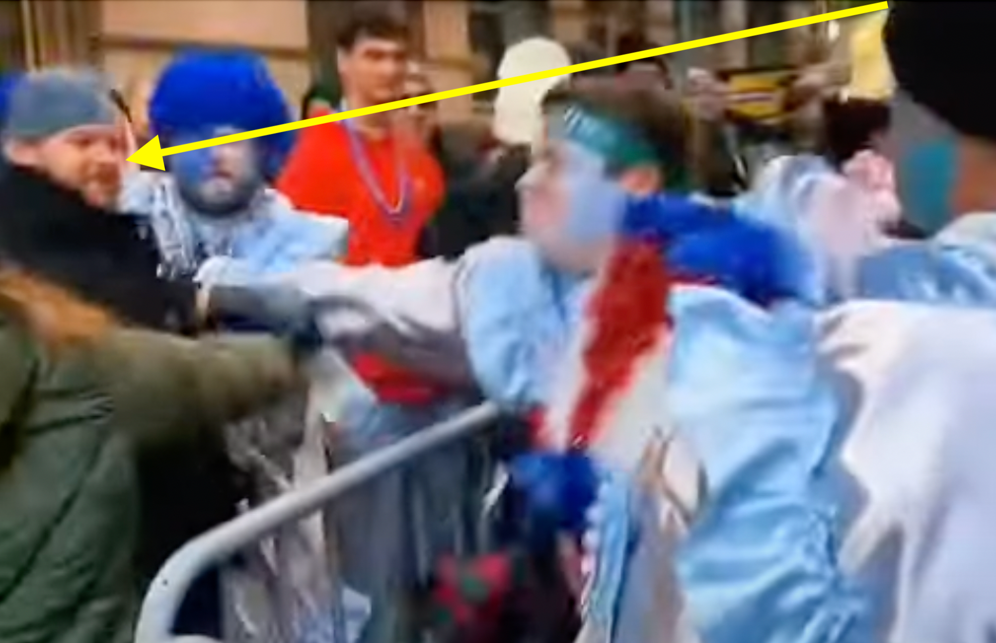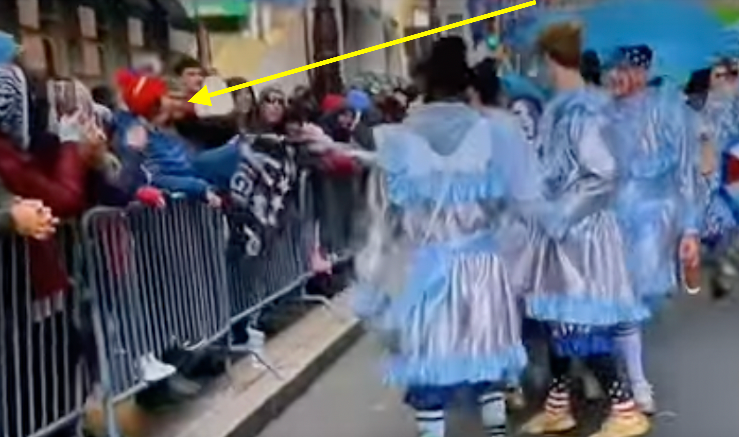 Suddenly, the Mummer brings the flag down to the face and head of the parade watcher, and he retaliates by grabbing the flag. It isn't clear why the Mummer used the Trump flag in that way.