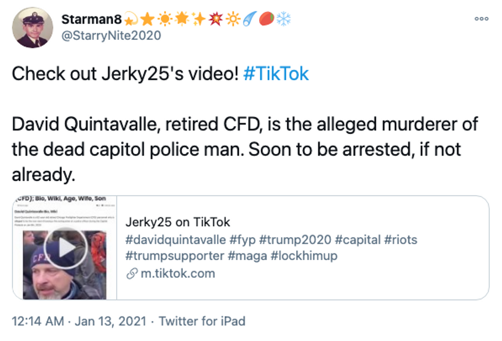 Quintavalle — who reportedly retired from the fire department in 2016 after more than three decades of service — became the target of a flurry of unsubstantiated accusations Tuesday after photos posted online showed a similarly looking man wearing a "CFD" hat wanted in connection with an attack during the riot.