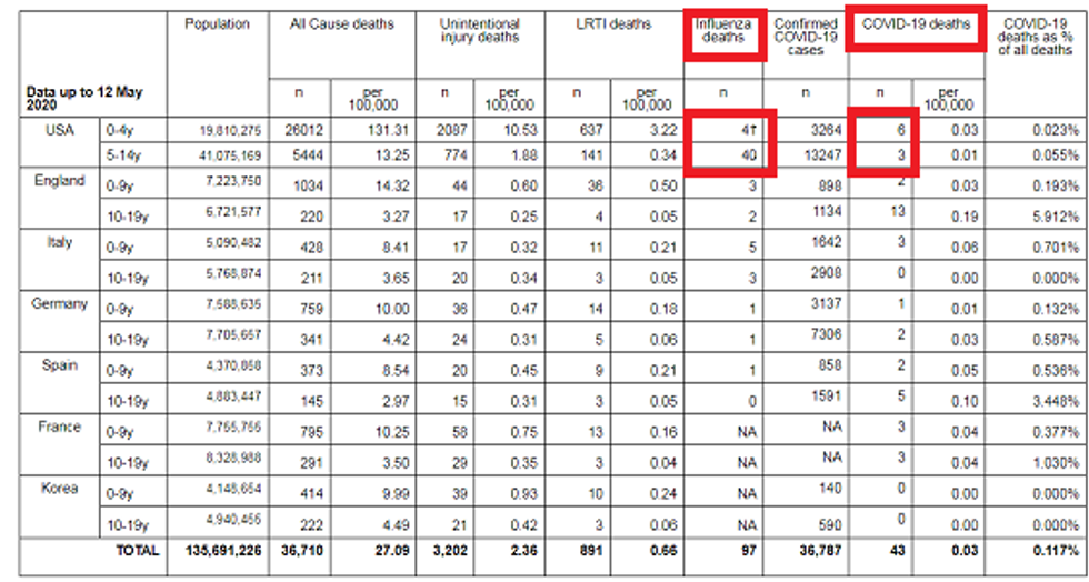 Just how much more of a risk is the flu to children than COVID-19? A group of British pediatric doctors posted a chart online comparing COVID-19 deaths among children to flu deaths over the same period of time beginning in February. This is not even a comparison to flu deaths over a typical flu season (which would include December and January), but rather a comparison over the course of the epidemic, which includes April and May, which typically have few deaths from the flu. But still, at least in the United States, flu deaths have been much higher.