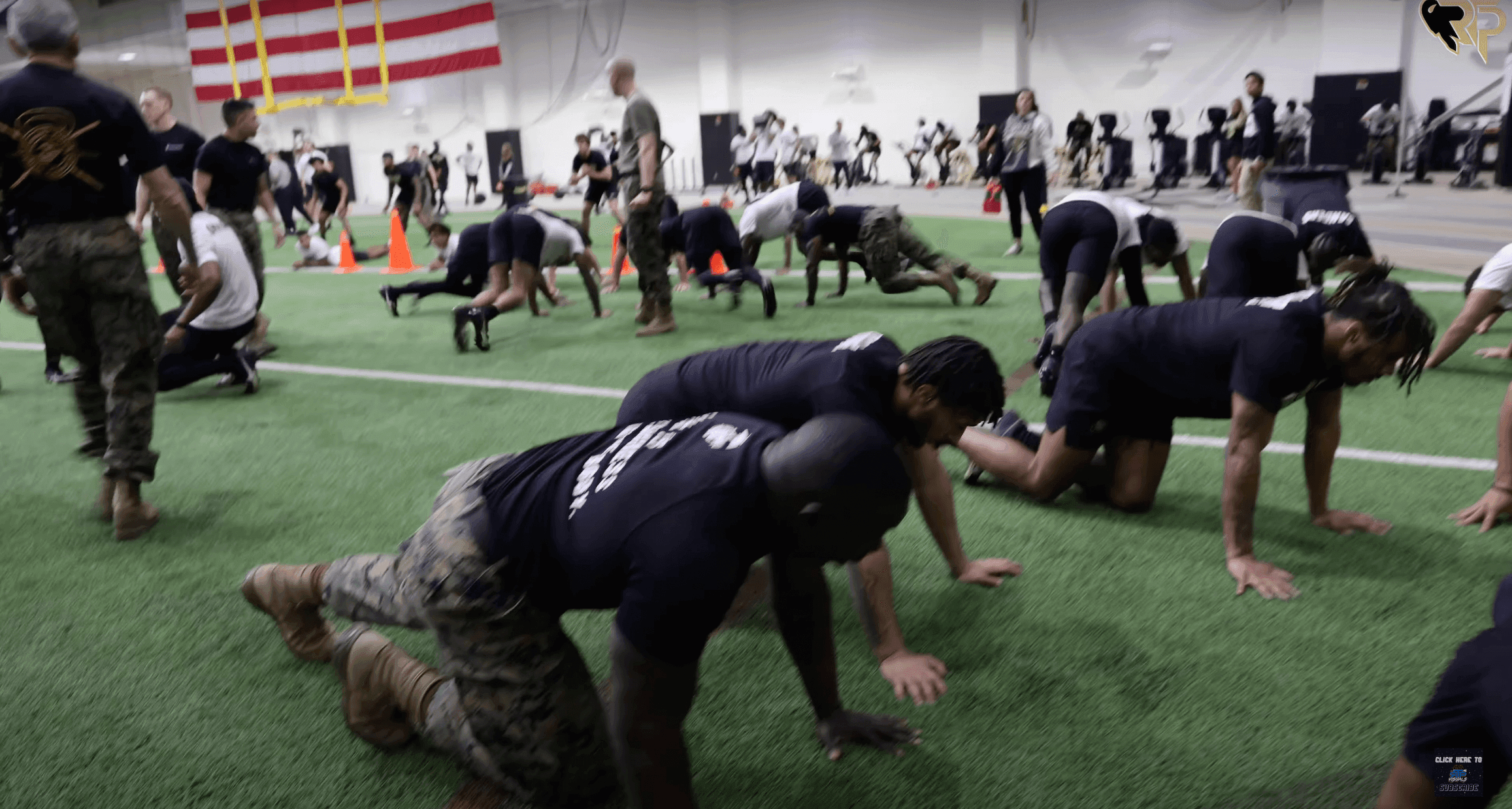 A 45-minute video captured the Marines putting the players through a "combat fitness test" with physical challenges that included "maneuver under fire, ammo can presses, air squats" as well as wind sprints.