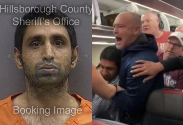 'Sit your a** down': Crazy video shows hulking 'linebacker' stifling unruly passenger hurling slurs, later waving skateboard