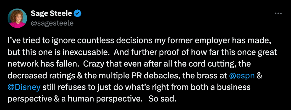 Nearly 17 years later, however, it all came to a screeching halt when Steele left the sports network after settling lawsuits she filed against both ESPN and its owner, Disney.